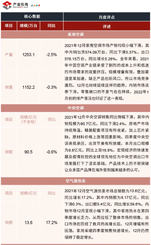 据产业在线数据显示,2021年12月,整体空调制冷产业链受上年高基数以及终端需求不振等因素影响表现平淡。内外销市场也出现了较大分化,空调类产品普遍是内销同比下降,出口增势良好。冰洗类产品则是内外销市场同步低迷。从单品来看,空气源热泵是本月的增长亮点。
